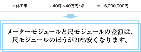 これを仮に、坪単価40万円とし、坪40万円の建物でそれぞれのモジュールで考えてみるとします。