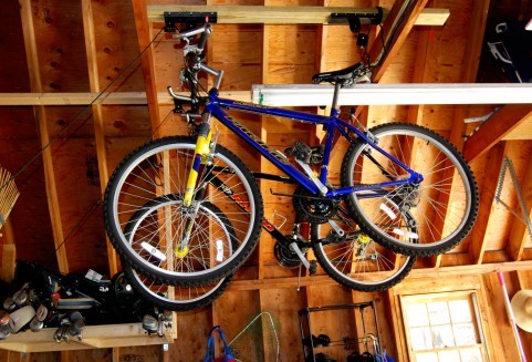 例えばガレージ内の壁に釘をうち自転車をかけて保管をするとか、タイヤの保管場所やゴルフバック、サーフボード、スキー、釣り道具などのアウトドア用品などを区分けできる棚を設置すると便利になります。