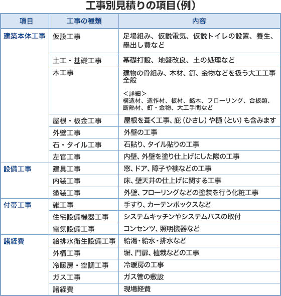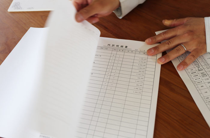 工事別見積もりには、工事の種類ごとに内訳が記載されているので項目をきちんとチェックし、疑問があるのなら、工務店や設計担当の建築家などに確認をとることをお勧めします。例えば途中で変更が必要になった場合、予算オーバーになったりなどトラブルに発展することもあります。