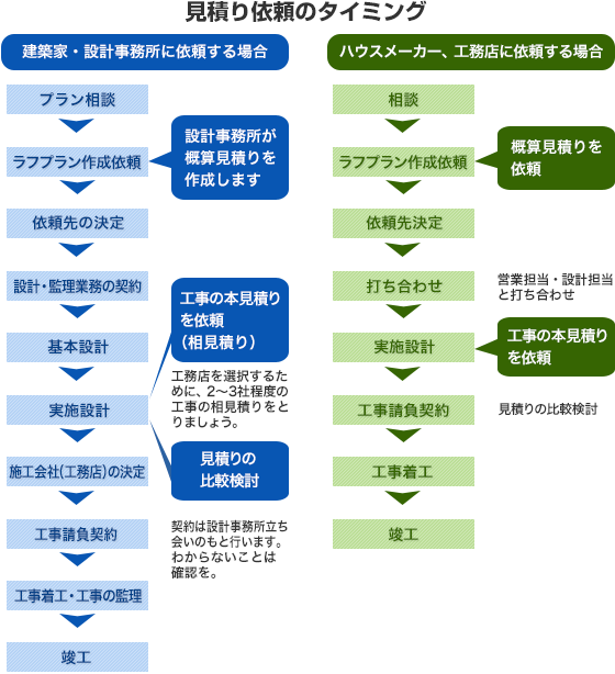 建築家・設計事務所に依頼する場合と、ハウスメーカー、工務店に依頼する場合の工程の違いについては下記の図が参考になります。見積もり依頼のタイミングなど詳細については下記の図を参考にしてください。