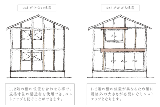 1・2階の壁をそろえると、家を安く建てることが出来る
