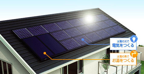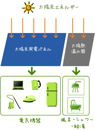 ちなみに、太陽熱温水器と太陽光パネルの、ふたつは同じ黒いパネルの形をしています。
