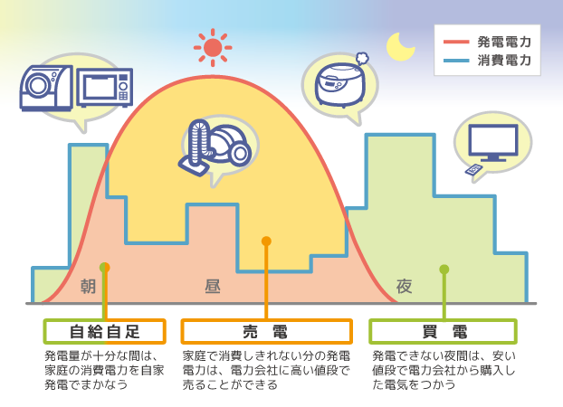 もちろん太陽光発電システムがなくても、日々、私たちは生活の中で電力を消費していますから、昼間に太陽光発電システムでまかなうことが出来た電力も収益と考えることが出来ます(電力会社から電気を買わずにすむため)。