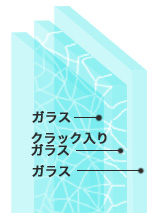 クラックガラスとは、3枚の合わせガラスで、強化ガラスを透明ガラスで挟んだガラスをいいます。