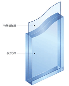 合わせガラスとは、2枚以上のガラスを強靭な樹脂の膜で接着して張り合わせたガラスのことを言います。