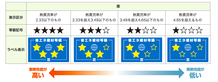 上のラベル表示をまとめた表を見て頂くとわかりやすいのですが、単純に黄色く塗りつぶされた「★」の表示が多いほど断熱性能の高い窓であるということがわかります。