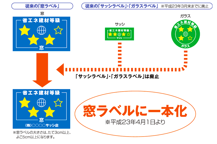 平成23年3月31日までは、窓等の断熱性能表示ラベルである省エネ建材等級が「窓ラベル」「サッシラベル」「ガラスラベル」と分かれていましたが、平成23年4月1日より、このラベル表示が「窓ラベル」に一本化されました。