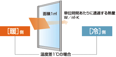 1㎡の面積あたり、1時間でどれくらい(何キロカロリー)の熱が流れるかを表すもので、数字が小さいほど、熱を逃がしにくく暖房のききやすい、冬暖かいガラスといえます。