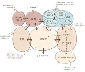 次に、各々のマイホームのテーマ(暮らし方)にそって、部屋のつながりを意識し、リビングを中心に各部屋の間取りを考えていきます。