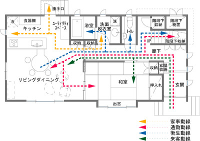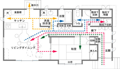 改善後の間取りを見て頂ければ一目瞭然ですが、「洗面脱衣室」と「浴室」の間取りを配置換えすることでキッチン側からも回遊できる家事動線になりました。