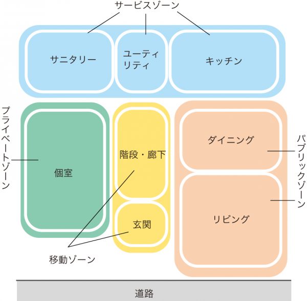 これはオールアバウト(All About)に掲載されている、ゾーニングによって作成されたざっくりとした間取りです。これを基本設計に落とし込むと次のようになります。