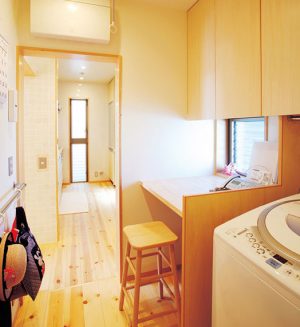 さらに便利にするのなら、キッチン、ユーティリティ、パントリー、洗面室、浴室を横一列に配置すると動線が確保できるので非常に使い勝手の良い間取りが生まれます。
