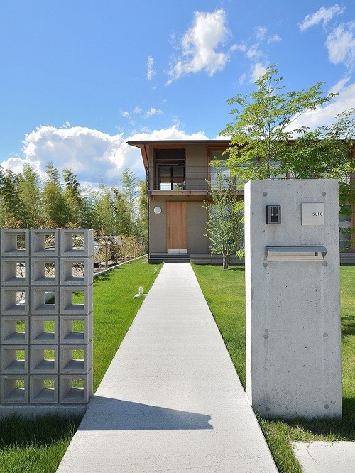 こちらはテクトン建築設計事務所の「借景を望むせがいの家」という住宅の玄関アプローチです。広い庭には芝生を敷き詰め、建物までまっすぐとのびるアプローチによって家へとまっすぐと誘う力強いアプローチになっています。