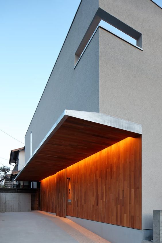 アトリエスピノザの「奥沢の家」の大屋根型のポーチです。間接照明により、迫力のあるポーチを演出しています。