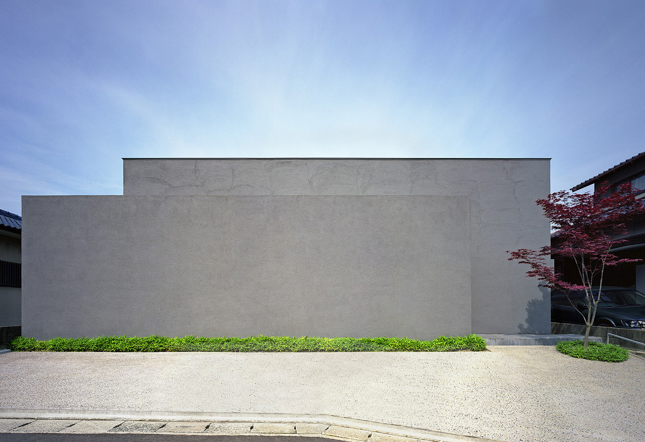 次郎丸の平屋を正面から見ると上の写真のような形になっています。正面には窓も何もなく非常にスタイリッシュな外観に仕上がっています。