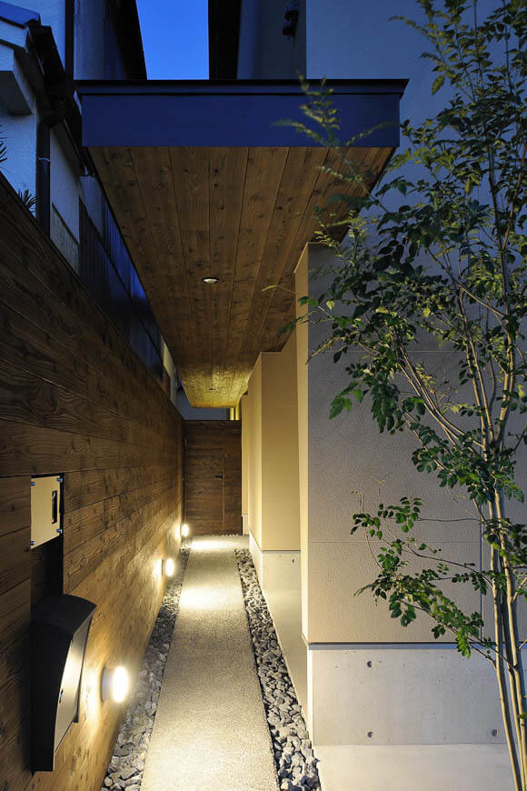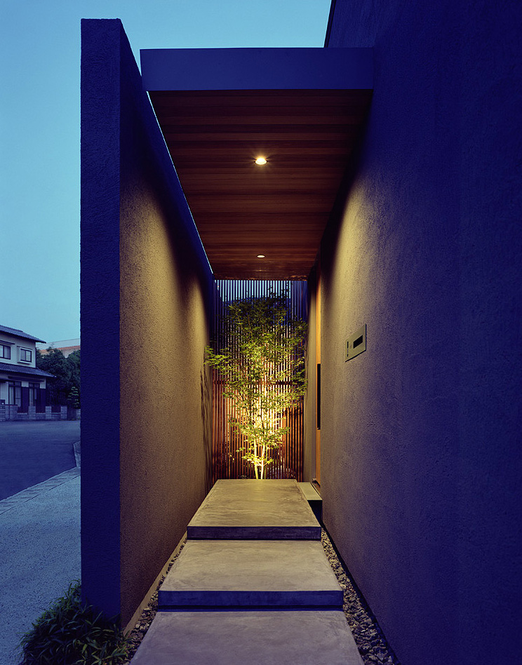 松山建築設計室の「次郎丸の平屋」の玄関アプローチです。道路から全く見えないように壁で囲い、照明設計と共に、よりプライベートな感覚を演出しています。