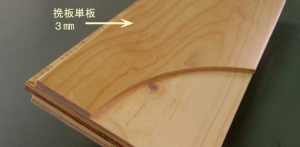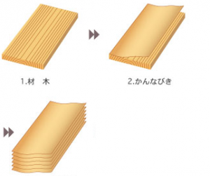 突き板フローリングのイメージとしては、合板などの基材に、天然木をカンナでかけた時に出るペラペラの木材を化粧板として張り付けているイメージです。