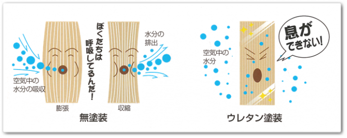 造膜タイプは革靴で言う、油化性のクリームで表面を保護するのに似ていて、浸透タイプよりも素材を保護する力などの性能力に優れている一方で、塗装で無垢材の表面を覆ってしまうことにより、木の呼吸(木の表面に空いている無数の穴)をふさいでしまうことになるので、無垢材がもつ優しい肌触りや、調湿性などの無垢材としての機能性も損なってしまいます(香りも閉じ込めてしまいます)。