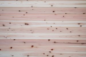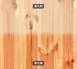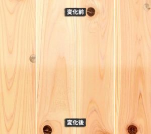 スギ材は、赤みを帯びた赤身と呼ばれる部分と、白い白太と呼ばれる部分で変化の仕方が違います。赤身の部分は赤身が抜けていき、少しずつ色調が濃くなっていき、最終的にはブラウン色に変色していきます。