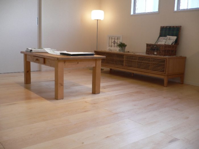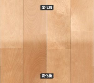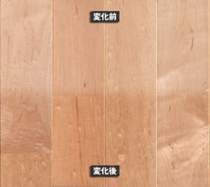 メープル材は、同系統である、白系の無垢フローリングのバーチ材と似たような変化をします。メープル材の経年変化の特徴としては、ゆっくりと時間をかけて、色の深みが増し、黄色みを帯びて、やがて飴色に変化していきます。