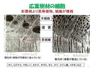 広葉樹の組織構造は非常に複雑で、細胞の種類が多く、ひとつひとつの機能も分業していたり、専門化して働いています。例えば、広葉樹は、針葉樹と違い水分の通り道は主に「導管」が補っており、木を支える為の組織は「木部繊維」が担っているほか、養分を溜め込む為の貯蔵機能は「柔組織」によって補われています。