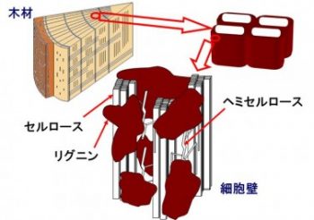 木材は鉄筋コンクリートのよう:数は高温乾燥でセルロースが破壊されヘミセルロースが溶け出している図