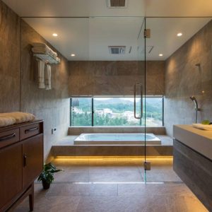 オプションで、壁の色や照明、カウンター材などの細かい変更はできますが、浴室自体がパッケージ化されているため、浴室自体のサイズ変更や、壁一面に、庭をのぞけるような大きな窓をつけるなどの、大きな変更は出来ません。