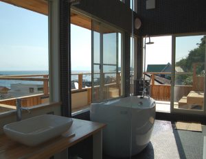 システムバスと違い、パッケージ化されておらず、ひとつひとつの部材にこだわって浴室のプランニングが出来ます。在来風呂では、例えば浴室に大きな窓をつけたり、露天風呂をつくることもできます。