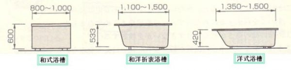 和洋折衷浴槽の一般的な幅は1100ミリから1600ミリ程度で、一般的な浴槽の高さは600ミリ程度とされています。
