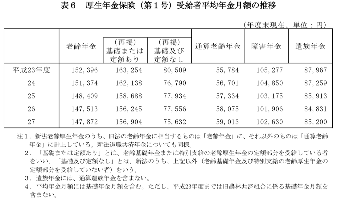 さらに「表6 厚生年金保険(第1号)受給者平均年金月額の推移」によると、厚生年金は平成23年度は152,396円なのに対して平成27年度では147,872円となっており、減少傾向が続いていることがわかります。
