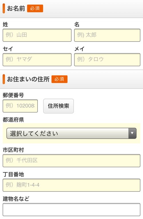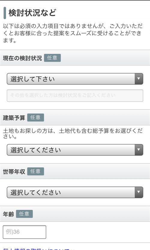上から順に住宅カタログの送付先の「お名前」、「お住まいの住所」などをうめて行きます。
