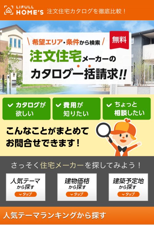 まず、「注文住宅<無料>カタログはこちら/HOME’S」をタップ(クリック)していただくと下記の画面のようなLIFULL HOME’Sのトップページに飛びます。