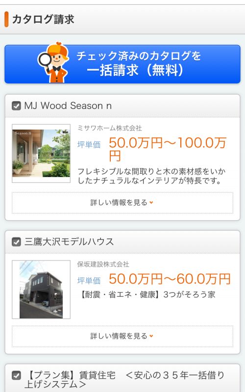 上のように住宅会社が一覧で出てきますので、「詳しい情報をみる」などから、各住宅会社の情報を確認し、気になった住宅会社にチェックを入れていきます。