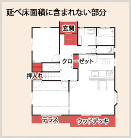 例えば「延べ床面積」には、玄関ポーチ、クローゼット、押入れ、テラス、ウッドデッキ、ロフト(小屋根裏収納)、地下室などは含まれません。