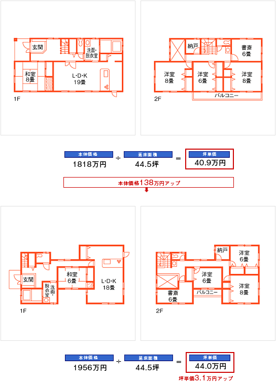 そして、当然ですが、より大きな数値で割った方が坪単価は安くなります。