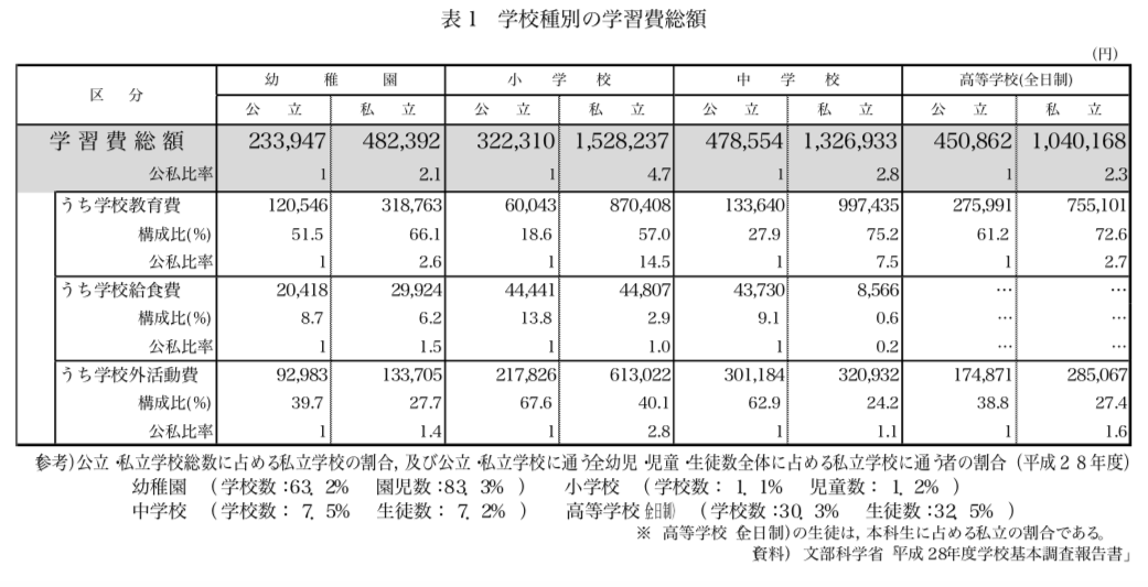 また保護者が支出した1年間・子供一人当たりの学習費総額(保護者が子供の学校教育及び学校 外活動のために支出した経費の総額)を見てみると、公立幼稚園で23万4千円、私立幼稚園で48万2千円と倍以上の開きがあり、公立小学校に通った場合は32万2千円、私立小学校に通った場合は152万8千円が年間に必要となるとされています。