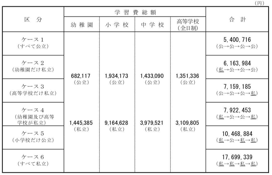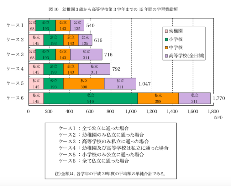 文部科学省の「平成28年度子供の学習費調査」によると、幼稚園3歳から高等学校第3学年までの15年間を全て公立に通った場合の学習費総額は約540万円、私立に通った場合の学習費総額は約1,770万円となっています。