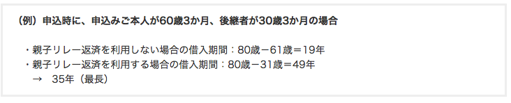 つまり、申込者本人の年齢にかかわらず、後継者である子の申し込み時の年齢をもとに借入期間を選択することができます。