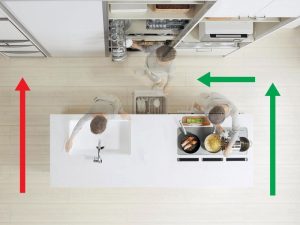 その上で、調理の流れを意識したキッチンにするにはどのように配置すればいいのか、ワークトライアングルの関係やレイアウトの観点から調理動線を始め家事動線を意識したキッチンの作り方についてお話ししてきました。
