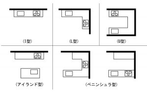 基本となるキッチンの形には「I型」「II型」「L型」「コの字型」「アイランド型」「ペニンシュラ型」があり、それぞれの形の特徴とメリット、デメリット、レイアウトのコツなども合わせてお話ししてきました。