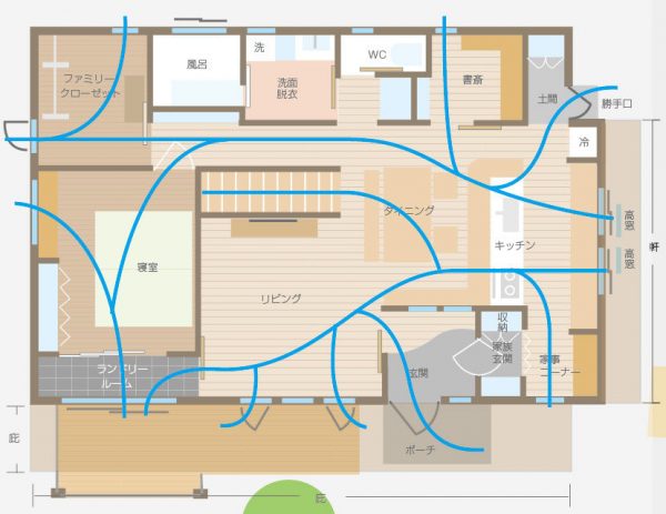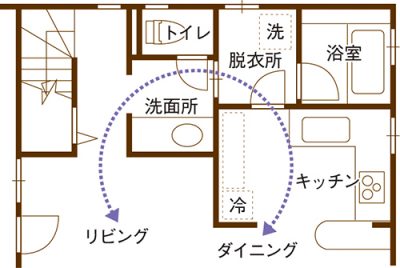 この場合、キッチンの横に家事室、洗面所、浴室などの水回り関係の間取りを集中させることで家事動線に優れた間取りになります。