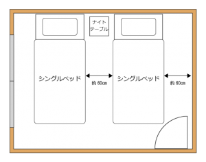 寝室ベッドの配置と寸法1:シングルベッド×2+ナイトテーブル