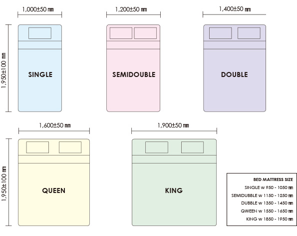 厳密に言えば各メーカーにより違いがありますが、一般的に用いられるベッドの寸法は、おおよそ次の通りとなっています。
