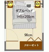 寝室ベッドの配置と寸法3:ダブル+ナイトテーブル×2