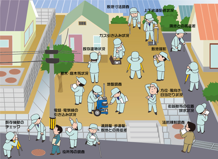 土地の大きさや高さ、隣地との関係、道路の接道状況などを調べる必要がありますが、正確な敷地測量を行うためには、必ず敷地調査が必要になります。