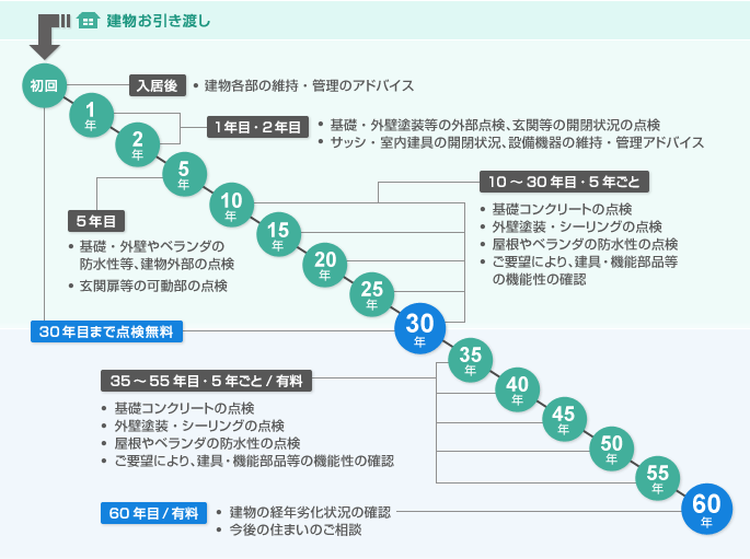 「ロングライフプログラム」という独自のメンテナンスや、定期点検システムにより、30年目までは点検が無料となっており、その後も5年ごとに有料で点検を行うことができます。