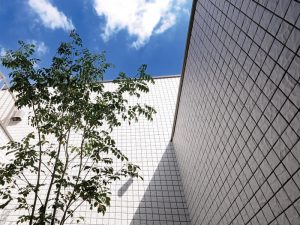 確かに外壁タイルに光触媒を焼き付けていることによって、外壁が汚れにくくなっているのは事実ですが、光触媒は、太陽光が当たらない部分は効果が期待できませんし、実際、ちょうど日陰になる部分が汚れている壁を何度も見たことがあります。