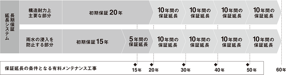 また「雨水の侵入を防止する部分」も同様に、初期保証の15年間が切れる前に有料メンテナンスを行うことで5年間の保証延長が受けられ、最大で60年間の保証を受けることができる内容となっています。