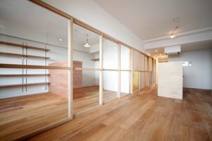 「扉」などの「建具」をできるだけ省き、「カーテン」を「間仕切り」として代用することで、明るく開放的な空間にすることができ、さらにコストダウンもはかれます。