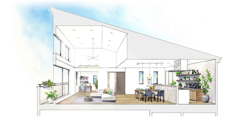 2階リビングの場合、屋根の形がそのままの、勾配のついた「勾配天井」にすることができます。